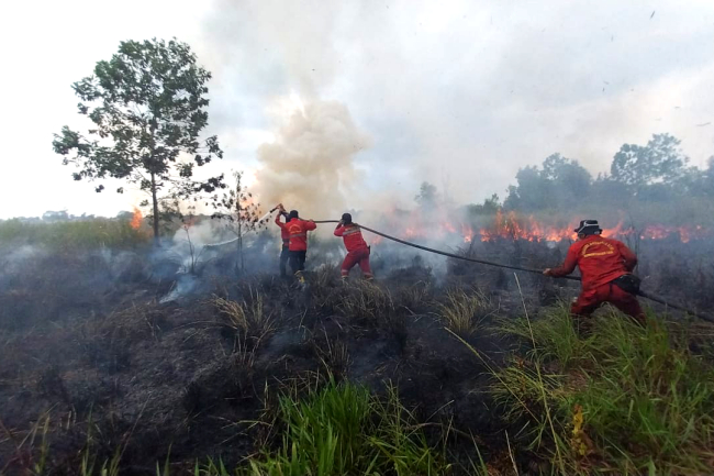 Dengan kompak petugas Manggala Agni bersama Satgas Karhutla dalam hitungan 30 menit mampu “memukul mundur” api yang hendak merambat dibantu hembusan angin yang cukup kencang.