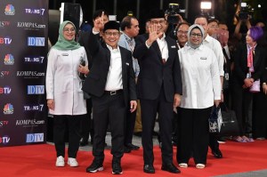 Calon presiden nomor urut 1 Anies Baswedan (kedua kanan) didampingi istri Fery Farhati Ganis (kanan), calon wakil presiden Muhaimin Iskandar (kedua kiri) dan istri Rustini Murtadho (kiri) berpose saat tiba di Jakarta Convention Center (JCC) untuk mengikuti