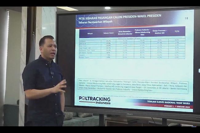 “Sumatera Prabowo mengalami kenaikan, Anies mengalami penurunan, Ganjar mengalami penurunan cukup dratis,” kata Direktur Eksekutif Poltracking, Hanta Yuda pada Jumat (19/1).