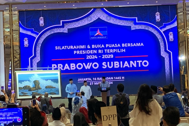 “Jadi Pak SBY, saya sangat terharu karena Bapak begitu menghormati saya dengan tangan Bapak sendiri, Bapak memberikan lukisan kepada saya,” kata Prabowo saat sambutan di acara buka puasa bersama Partai Demokrat, di Hotel St Regis, Jakarta, Rabu (27/3).